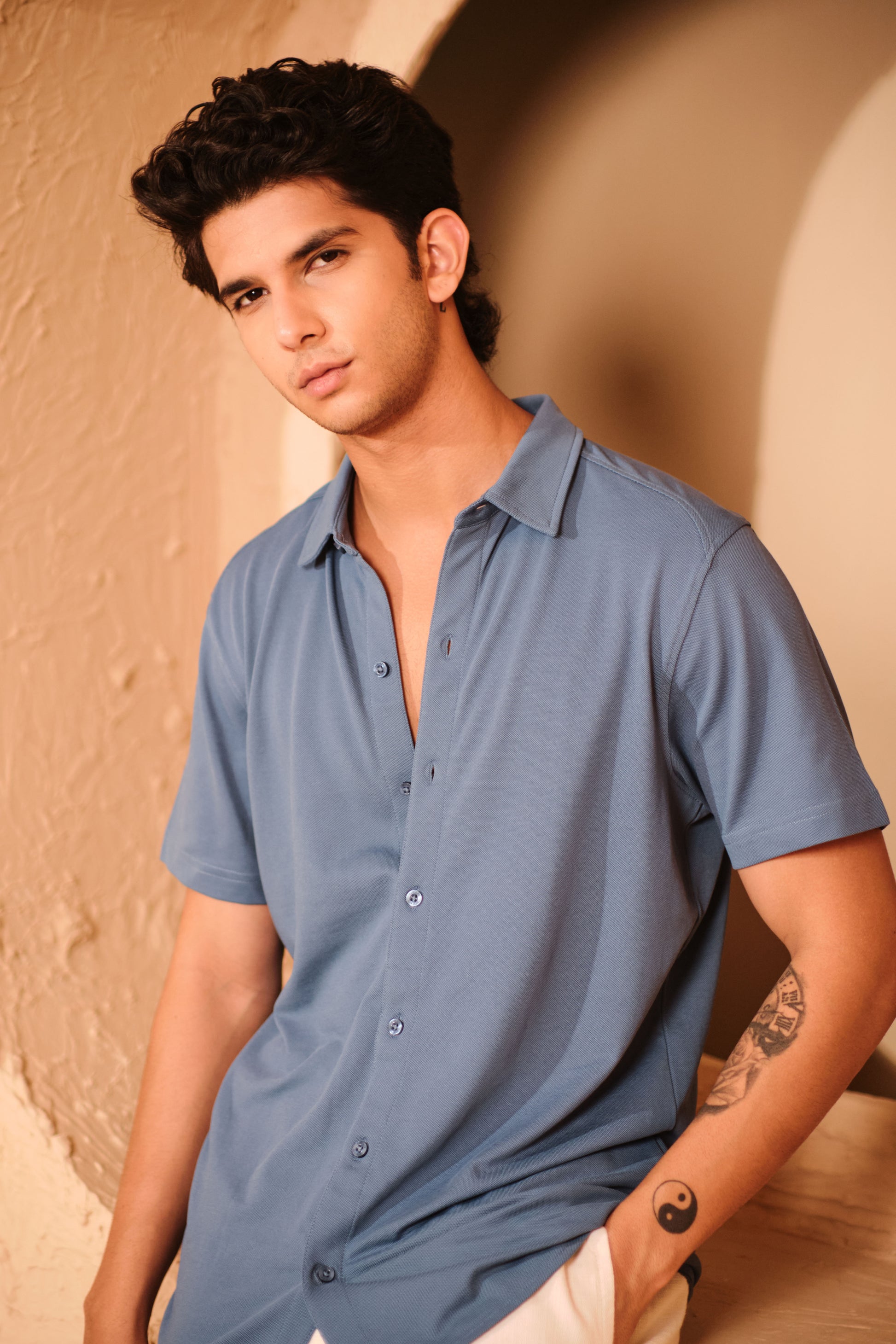 Knitique Men's All Day Half Sleeve Shirt - Regular Fit Cotton Rich Tri-Blend Fabric - Moonlight Blue