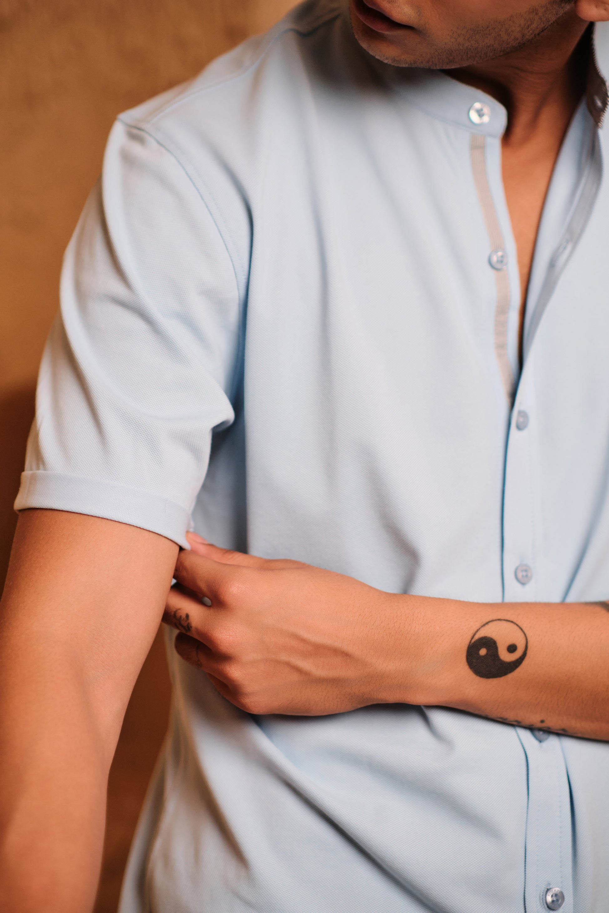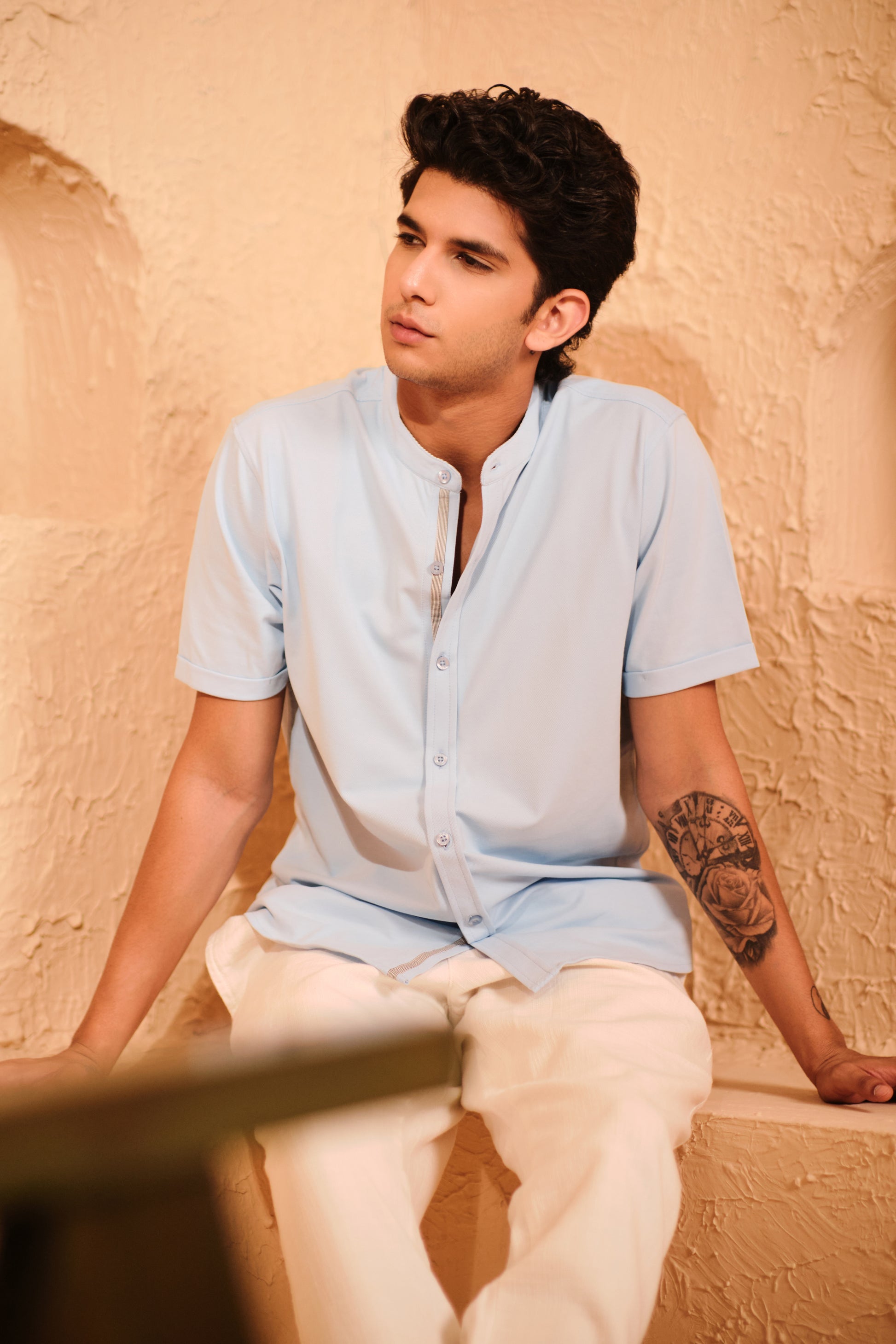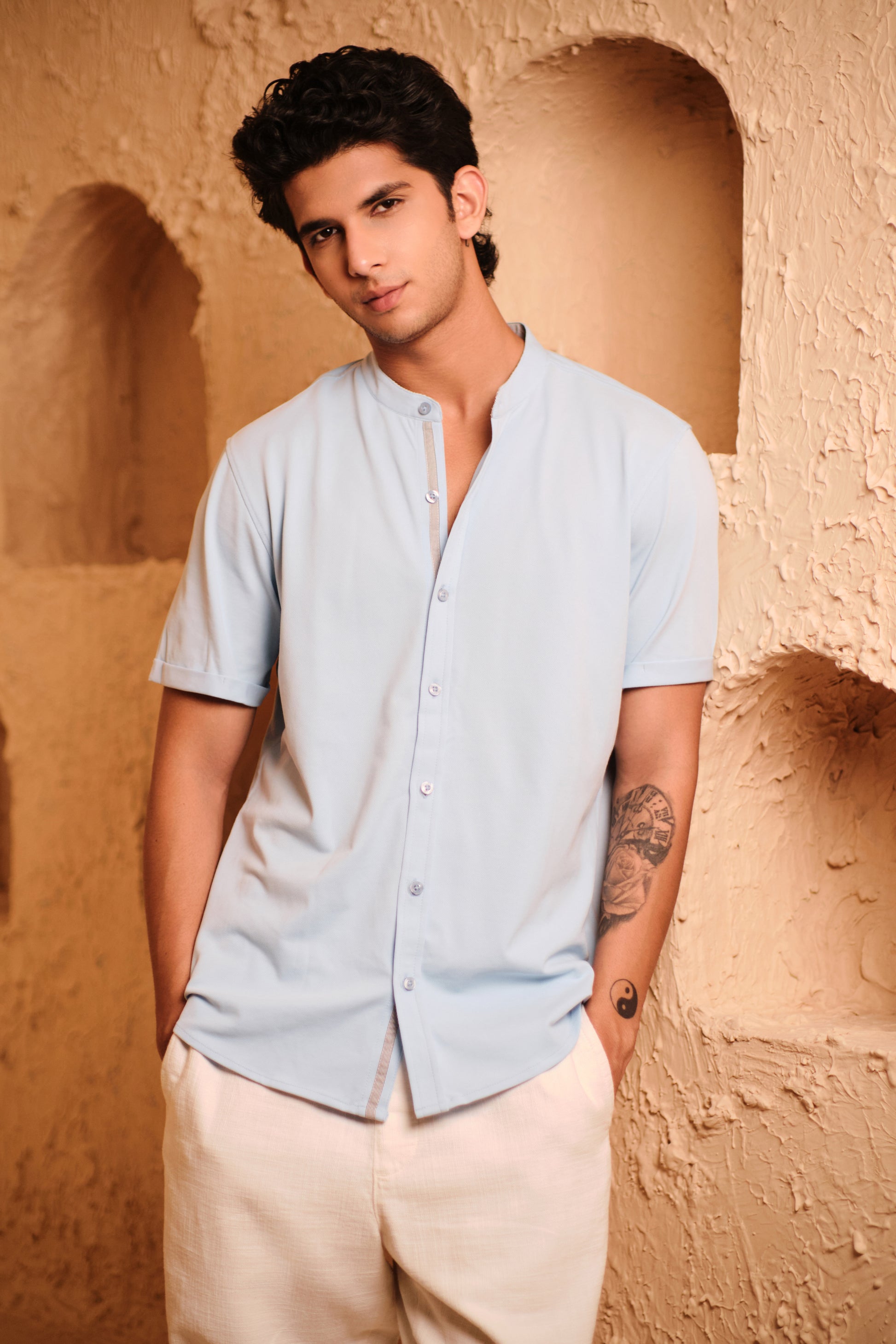 Knitique Men's Mandarin Half Sleeve Shirt - Regular Fit Cotton Rich Tri-Blend Fabric - Celeste Powder Blue